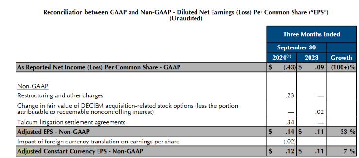 - GAAP net income was -$0.43 during the quarter. Adjusted net income (Accounting for restructuring charges and the charges from the talcum litigation, these charges totalled $0.57) came in at $0.12 in constant currency.