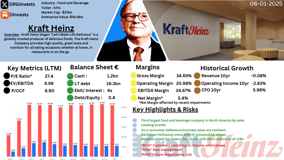 Kraft Heinz One PagerD InvestsJan 10, 202511ShareHistorical growth has been stagnant due to divestitures of non core businesses.Net margins and P/E ratio affected by recent impairments.SubscribeLink to my investment case here ——>