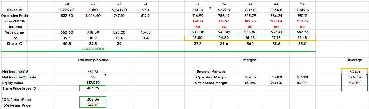 In valuing POOLCORP I used an EPS exit multiple model. In my assumptions I have imputed the following.