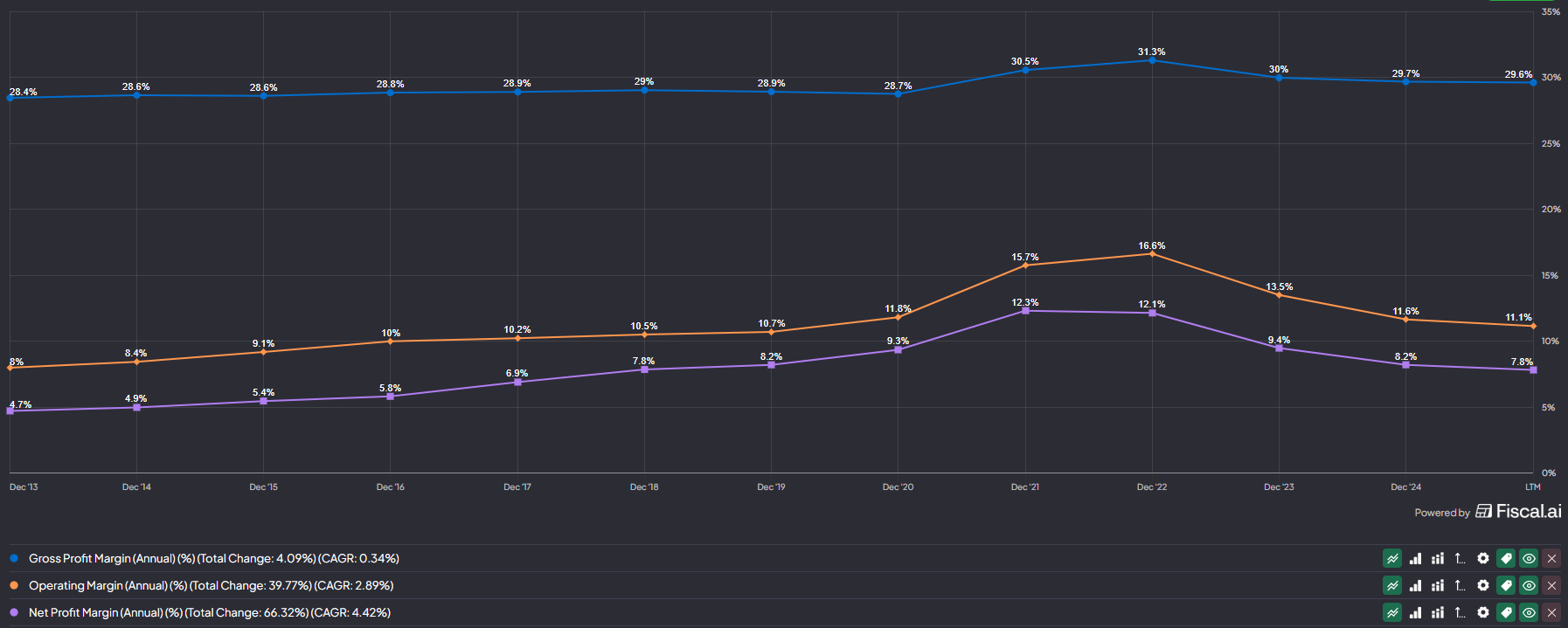 POOLs margins show a steady incline over the past decade but was distorted by the pandemic. As margins have decreased since 2022 we can say margins have started to normalise. Again, showing the power of gross margin which has increased 120pbs and also their operational efficiency net income margin has increased by 310bps.