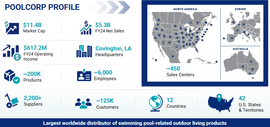 POOLCORP was founded in 1993, is the worlds largest wholesale distributor of swimming pool and related outdoor living products. Since its IPO in October 1995, the company has achieved an annual shareholder returns of 29% through market share gains, strategic acquisitions and excellent operating execution.